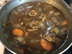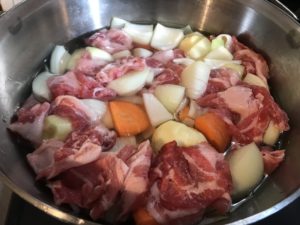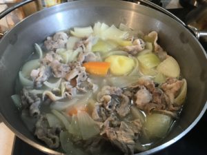 鍋に野菜とお肉を入れ、水を1000ml入れてそのまま15分煮ます。(煮る前に炒めません)