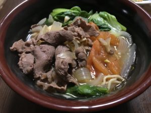スープができたら麺を茹でて盛り付けして出来上がり!生姜とにんにくが効いた野菜たっぷりの牛肉麺です。温まりますよ。