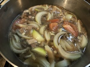 鍋にはちみつ、細かく切った生姜とにんにく水と調味料を入れ、煮立ったら牛肉、トマト、玉ねぎを加えて蓋をして中火で10分煮ます。