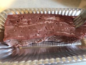 ローストビーフをフォークで全体的にまんべんなく刺します。