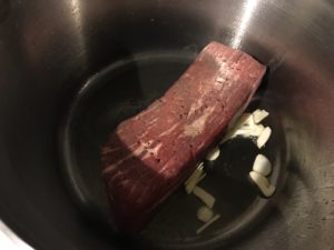 ダッチオーブンを火にかけて、オリーブオイルを入れます。しばらくしてからスライスしたにんにくを投入します。